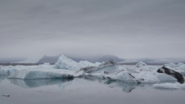 Broad view over the frozen glacial lagoon showcasing different blue arctic icebergs and snow-covered mountain range in the backdrop