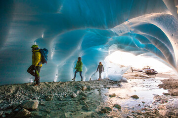 A mystical ice cave entrance illuminated by a cold blue glow, blending glacial blue to silver tones in a realistic, hyper-detailed scene. The image evokes exploration, mystery, and natural wonder, mak