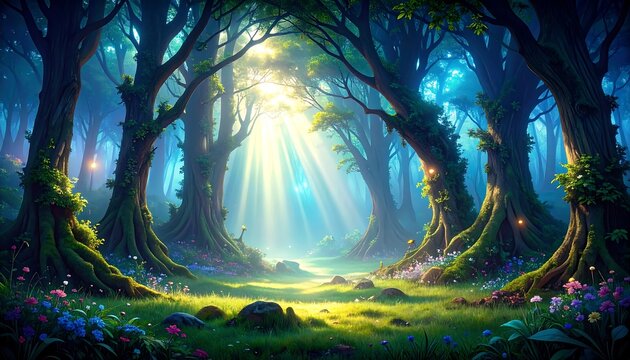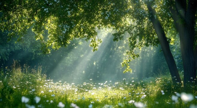Lush forest glade bathed in sunlight