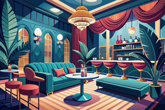 Visualize a glamorous cocktail hour in a swanky lounge area with velvet couches and a sleek marble bar