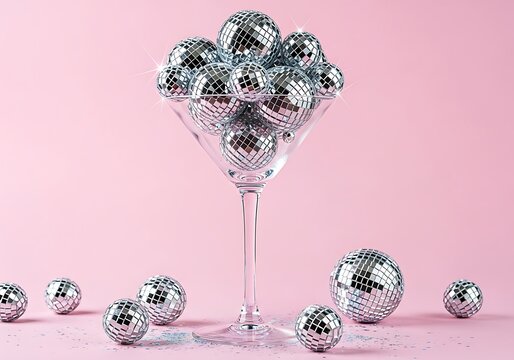 Martini glass filled with disco balls on pink background, creating a festive and glamorous atmosphere for celebration and entertainment