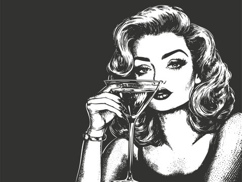 Vintage-style illustration of a glamorous woman holding a cocktail glass.