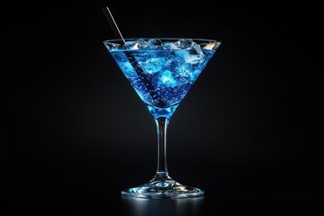 Vibrant blue cocktail in martini glass with ice and black straw on black background