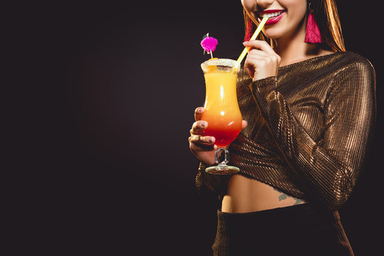 Glamorous black woman in sophisticated formal dress toasting with martini cocktail