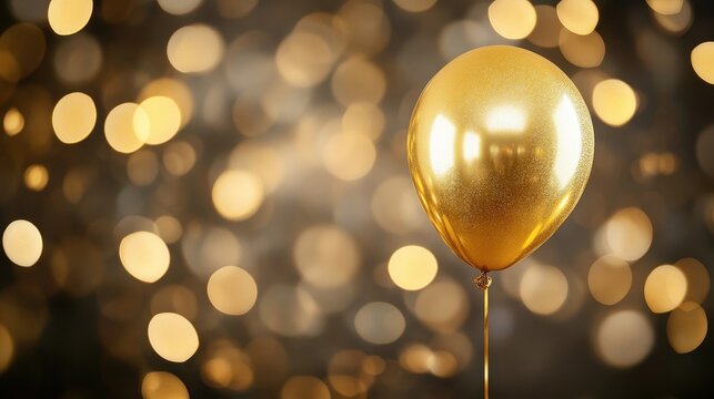 Close-up of a single golden balloon with a bokeh party background, luxurious and elegant event theme