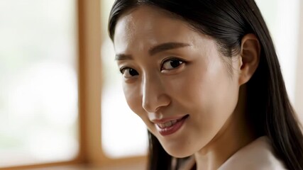 Portrait of a Woman Smiling Stylishly - The video shows a woman with long dark hair, glancing over her shoulder with a subtle, confident smile.