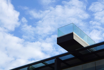 Moderne Balkone, verglast mit Metall-Geländer an Neubau-Hausfront mit Flachdach, Wasserkästen, Regenfallrohren und Edelstahl-Attika
