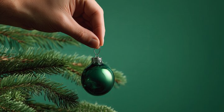 Hand decorating christmas tree with baubles