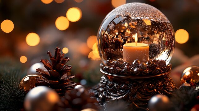 Transparent glass sphere on ornate metal base, assorted miniature baubles and pine cones scattered around, soft candlelight reflections on surface