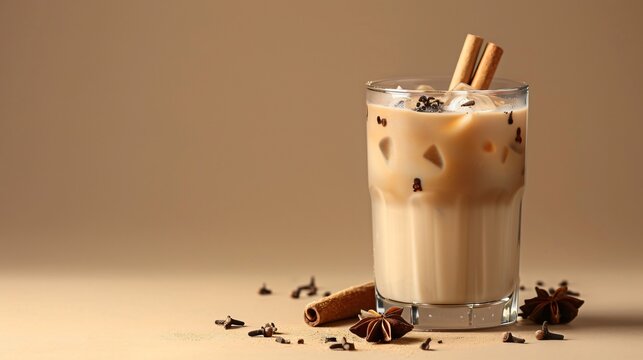 Soft beige backdrop showcasing a sleek glass of iced chai latte with cinnamon sticks and star anise