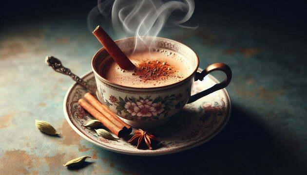 A clear glass cup filled with dark black chai tea with rising steam, surrounded by cinnamon sticks, star anise, and assorted spices on a rustic wooden surface