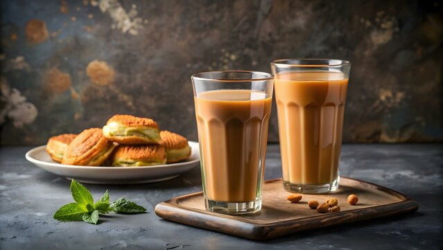 Indian chai in glass cups with metal kettle and other masalas to make the tea.