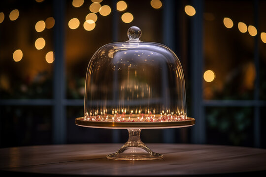 Clear glass cloche dome with a handle, placed on a table in a restaurant, showcasing an empty dish. Empty protective showcase for food mock-up with copy space. AI-generated