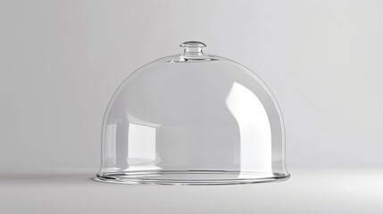 A clear glass cloche with a round knob on top sitting on a white surface in studio shot