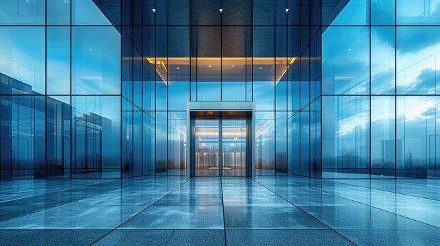 Modern office building with glass facade on a clear sky background. Transparent glass wall of office building.
