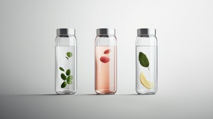Three glass water bottles with silver lids. the bottles are arranged in a triangular formation, with the largest bottle in the center and two smaller bottles on either side.