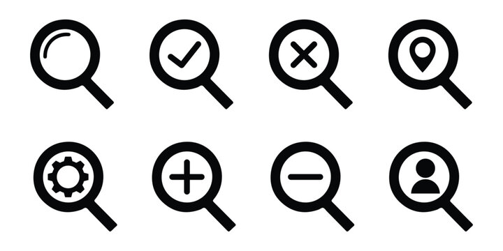 Simple black and white magnifying glass icon symbol of search and discovery concept for business information and design elements