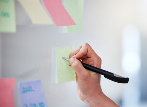Business meeting and scheduling planning with sticky notes on workflow moodboard for corporate sales success. Creative teamwork brainstorming and project strategy post-it notes on glass wall