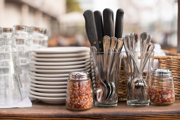 Empty navy blue plate and glass for water on blue background. Kitchen and cooking template, mock up. View from above.
