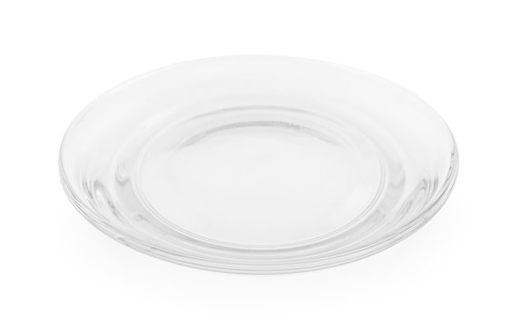 Glass bowl or plate isolated on white background. Close up view of an empty transparent cup. Glass plate 3D rendering model, mixing bowl, glossy dish. Side or front view.