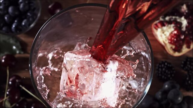 red juice pouring on ice inside glass top shot and slow motion