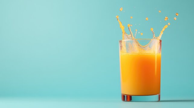 A splash of orange juice in a glass against a teal background
