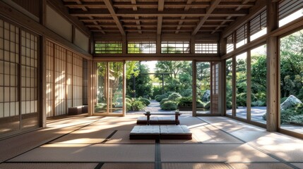 Traditional Japanese tatami room with low ceiling and shoji screens, minimalism