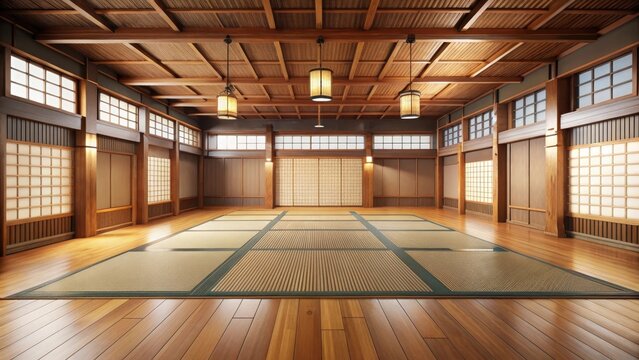 Traditional martial arts practice in a dojo with wooden floor and tatami mats, discipline, training,  discipline, training