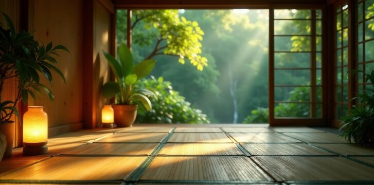 Softly glowing tatami mats amidst lush greenery, ambient light,