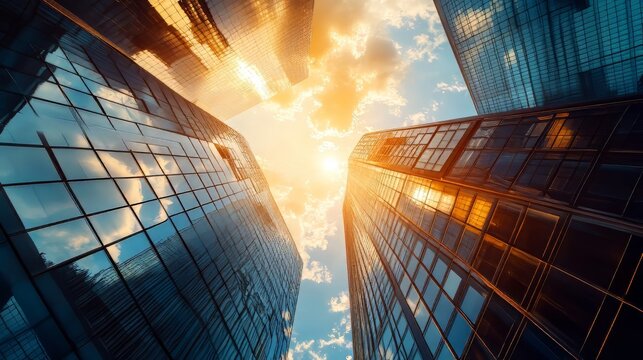 A dynamic perspective of a row of modern office towers with reflective glass facades under a vibrant sunset sky. Mirrored Infinity Towers. Illustration