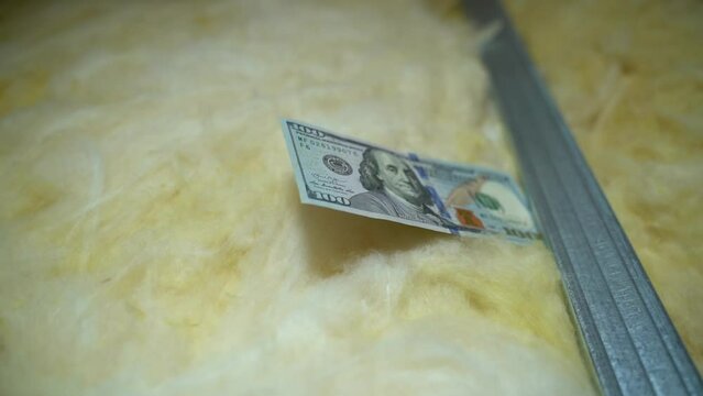 Glass wool, metal galvanized U profile and one hundred dollars close-up. Smooth camera movement, bottom view