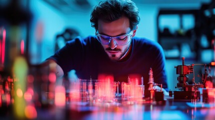An engineer wearing protective glasses works intently on high-tech precision machinery in a laboratory setting, focusing on detailed adjustments.