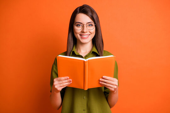Photo portrait of cheerful female student wearing glasses keeping book smiling isolated on vibrant orange color background