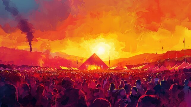 Low-angle view of Glastonbury Festival in golden hour, sea of people, iconic pyramid stage, vivid watercolor wash emphasizing the energy and diversity, filled with dynamic movement