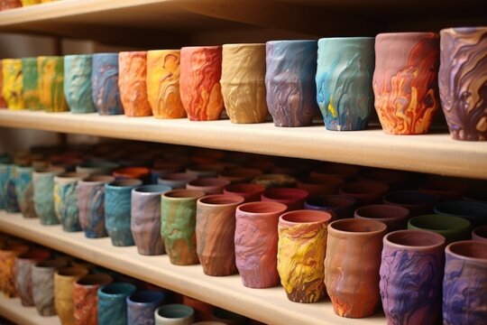 Creative display of pottery making with vibrant glazes