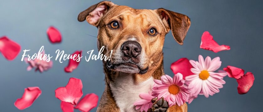 Frohes Neues Jahr Hund mit Blumenstrauß und Rosenblättern wünscht Glückliches Neues Jahr