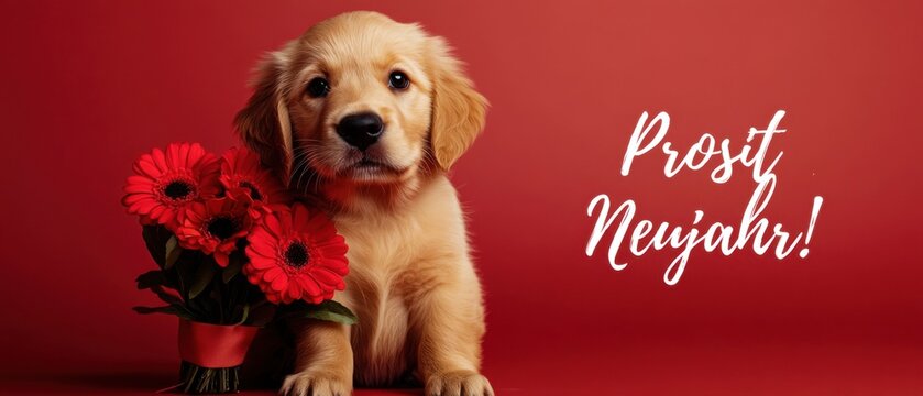 Niedlicher Goldener Retriever Welpe mit roten Gerbera Blumen zum Prosit Neujahr
