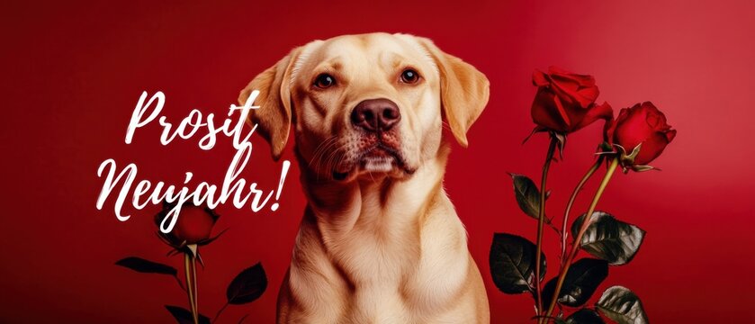 Labrador Hund mit Rosen zum Prosit Neujahr Glückliches Neues Jahr
