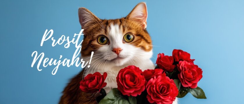 Niedliche Katze mit Rosen zum Prosit Neujahr Glückliches neues Jahr