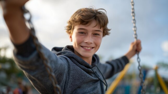 A boy enthusiastically swings back and forth on a swing, his face lighting up with glee as he takes in the sights and sounds of a lively playground bustling with activity. cinematic color
