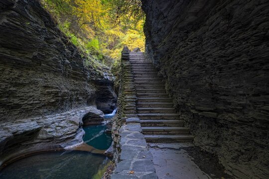 Beautiful shot of the historic Watkin's Glen steps near the waterfall in the fall