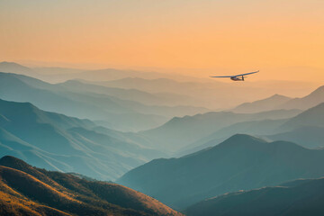 Glider aircraft soaring over vast layered mountains at golden sunset