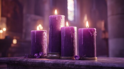 Purple candles glimmer softly on a serene altar, casting tranquil light that highlights the ancient architectural details of the sacred space.