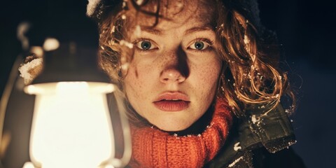 A Person Engaging with a Lantern in a Serene, Snowy Outdoor Environment, Embracing the Chill