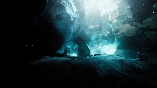 Soft light spills into a dark cave, creating a magical atmosphere. The rocky walls glisten with hues of blue, inviting exploration into the hidden depths of natures wonders.