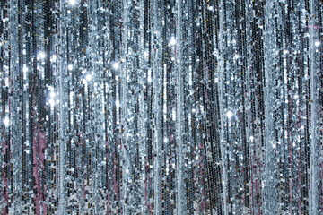 Shimmering silver curtain made of sequins glistening under bright lights in an indoor event space during the evening
