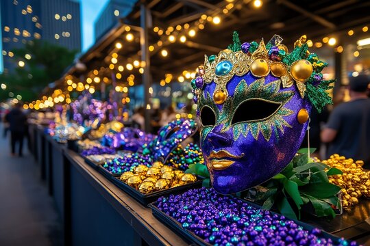 Colorful Mardi Gras mask adorned with beads and decorations at an outdoor market during the evening, with lights illuminating the scene.