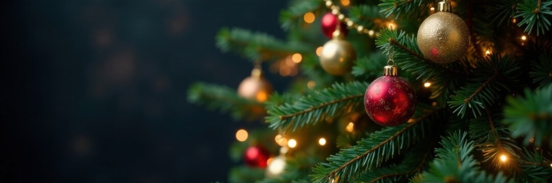 Evergreen Christmas tree adorned with glittering ornaments and colorful lights, snowflakes, gifts, garlands