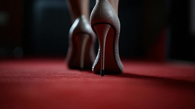 Close-up shot of high heels on a red carpet with a blurred background. Heels with glittery details are walking forward. Dramatic lighting sets an elegant atmosphere.