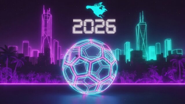 Soccer Ball and the Future: A futuristic depiction of the sport's global appeal, with a luminous soccer ball at the core, set against a neon cityscape and the year 2026. This image evokes energy.